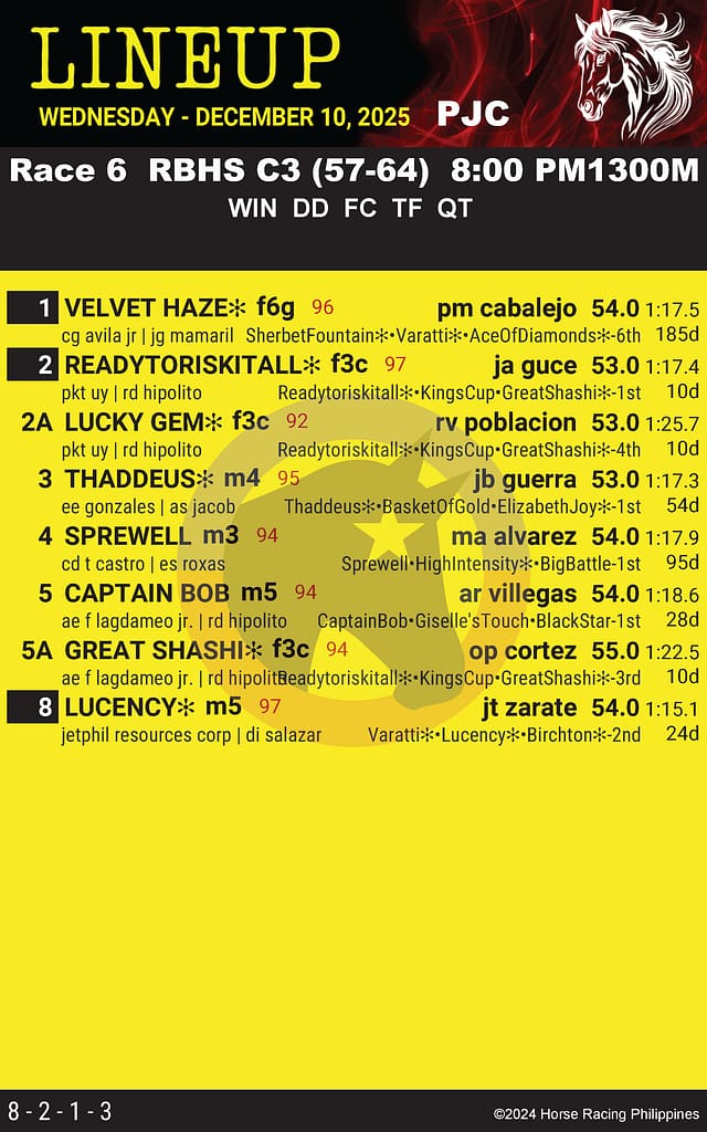 Get the official LineUp race program for Philippine Jockey Club on December 10, 2025 – Race 6. View entries, ratings, trainers, jockeys, and best performance. Free race card online from Horse Racing Philippines, no registration needed.