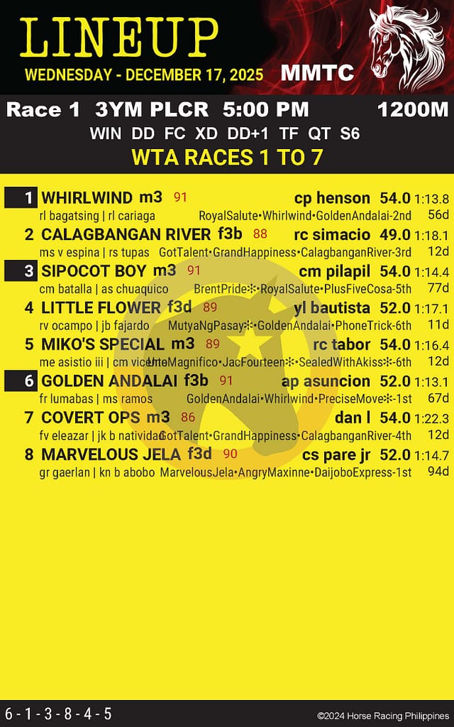 Get the official LineUp race program for Metro Turf on December 17, 2025 – Race 1. View entries, ratings, trainers, jockeys, and best performance. Free race card online from Horse Racing Philippines, no registration needed.