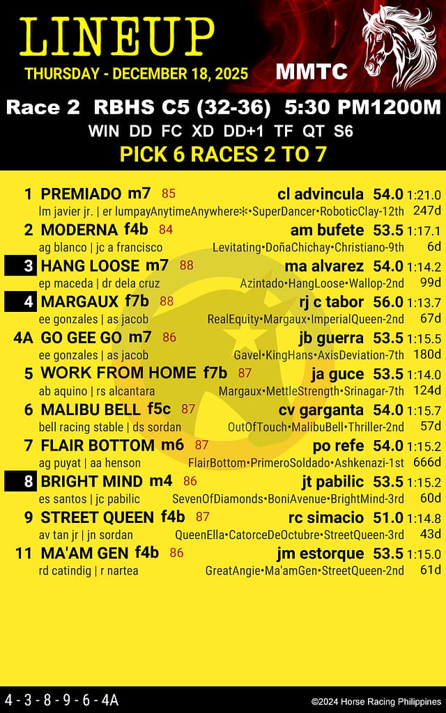Get the official LineUp race program for Philippine Jockey Club on December 18, 2025 – Race 2. View entries, ratings, trainers, jockeys, and best performance. Free race card online from Horse Racing Philippines, no registration needed.
