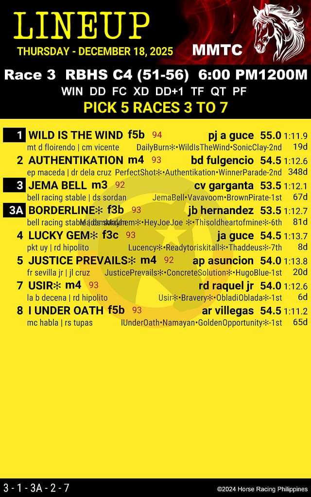 Get the official LineUp race program for Philippine Jockey Club on December 18, 2025 – Race 3. View entries, ratings, trainers, jockeys, and best performance. Free race card online from Horse Racing Philippines, no registration needed.