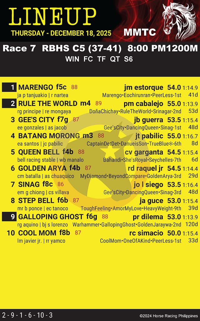 Get the official LineUp race program for Philippine Jockey Club on December 18, 2025 – Race 7. View entries, ratings, trainers, jockeys, and best performance. Free race card online from Horse Racing Philippines, no registration needed.
