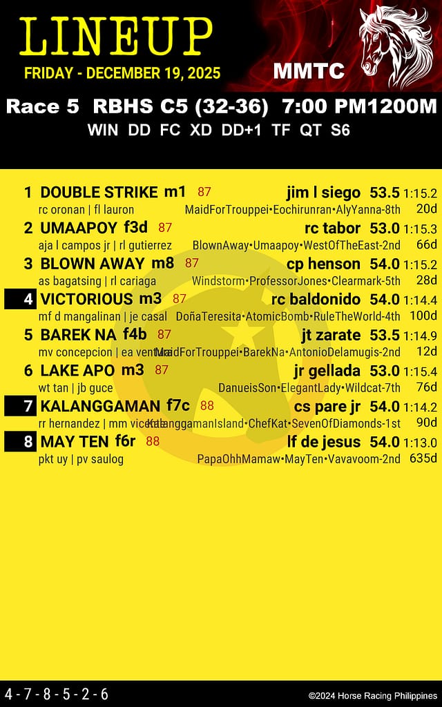 Get the official LineUp race program for Metro Turf on December 19, 2025 – Race 5. View entries, ratings, trainers, jockeys, and best performance. Free race card online from Horse Racing Philippines, no registration needed.