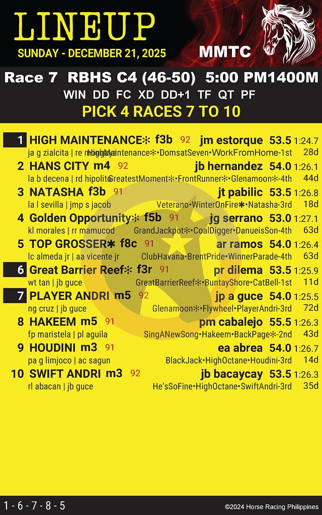 Get the official LineUp race program for Metro Turf on December 21, 2025 – Race 7. View entries, ratings, trainers, jockeys, and best performance. Free race card online from Horse Racing Philippines, no registration needed.