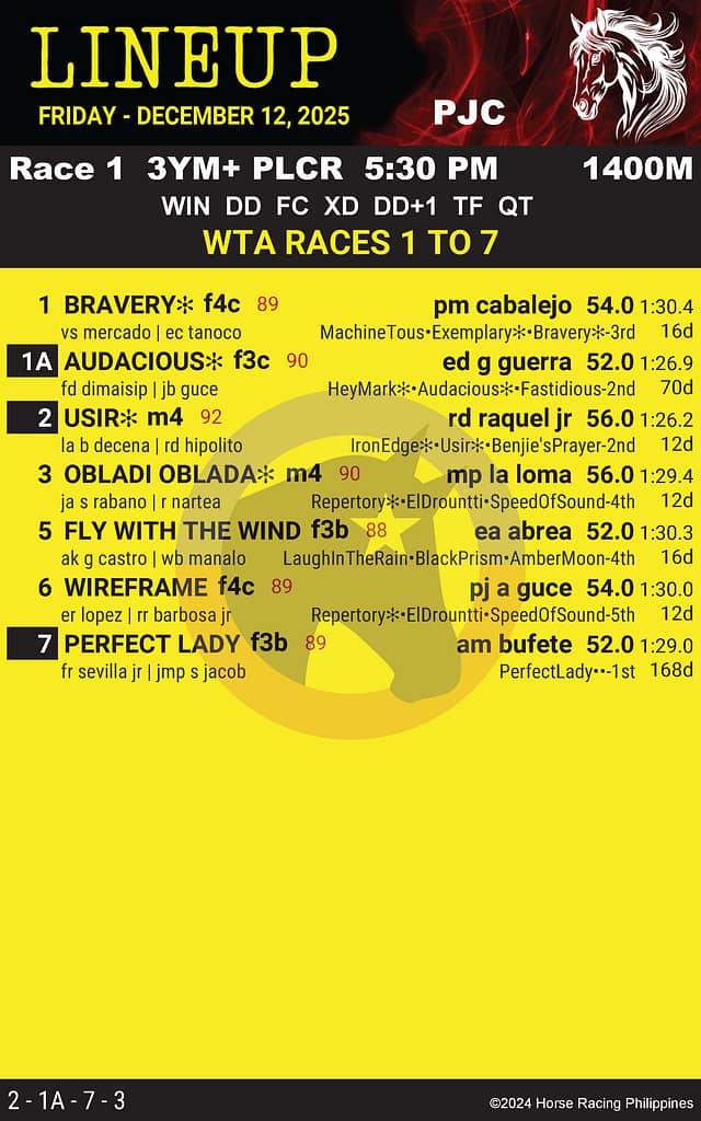Get the official LineUp race program for Philippine Jockey Club on December 12, 2025 – Race 1. View entries, ratings, trainers, jockeys, and best performance. Free race card online from Horse Racing Philippines, no registration needed.