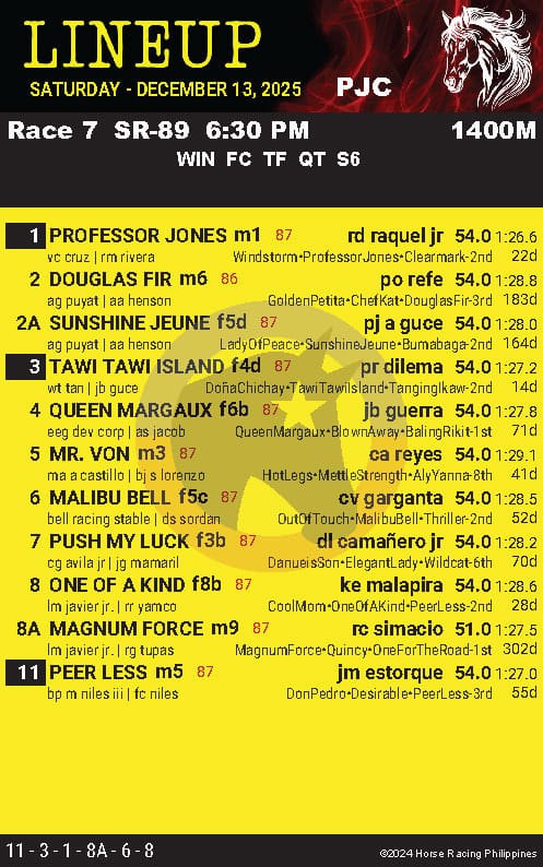 Philippine Jockey Club Race Card for December 13, 2025 – Race 7