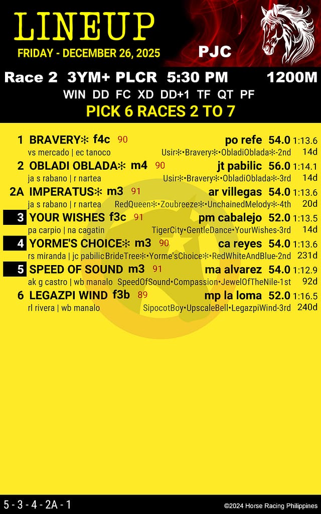 Get the official LineUp race program for Philippine Jockey Club on December 26, 2025 – Race 2. View entries, ratings, trainers, jockeys, and best performance. Free race card online from Horse Racing Philippines, no registration needed.
