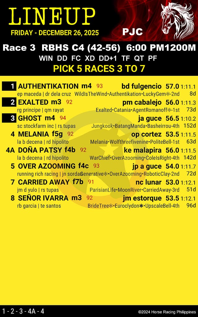 Get the official LineUp race program for Philippine Jockey Club on December 26, 2025 – Race 3. View entries, ratings, trainers, jockeys, and best performance. Free race card online from Horse Racing Philippines, no registration needed.