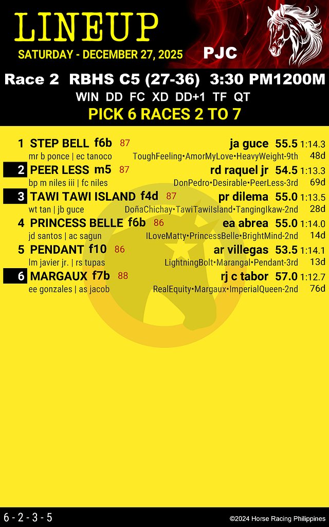 Get the official LineUp race program for Philippine Jockey Club on December 27, 2025 – Race 2. View entries, ratings, trainers, jockeys, and best performance. Free race card online from Horse Racing Philippines, no registration needed.