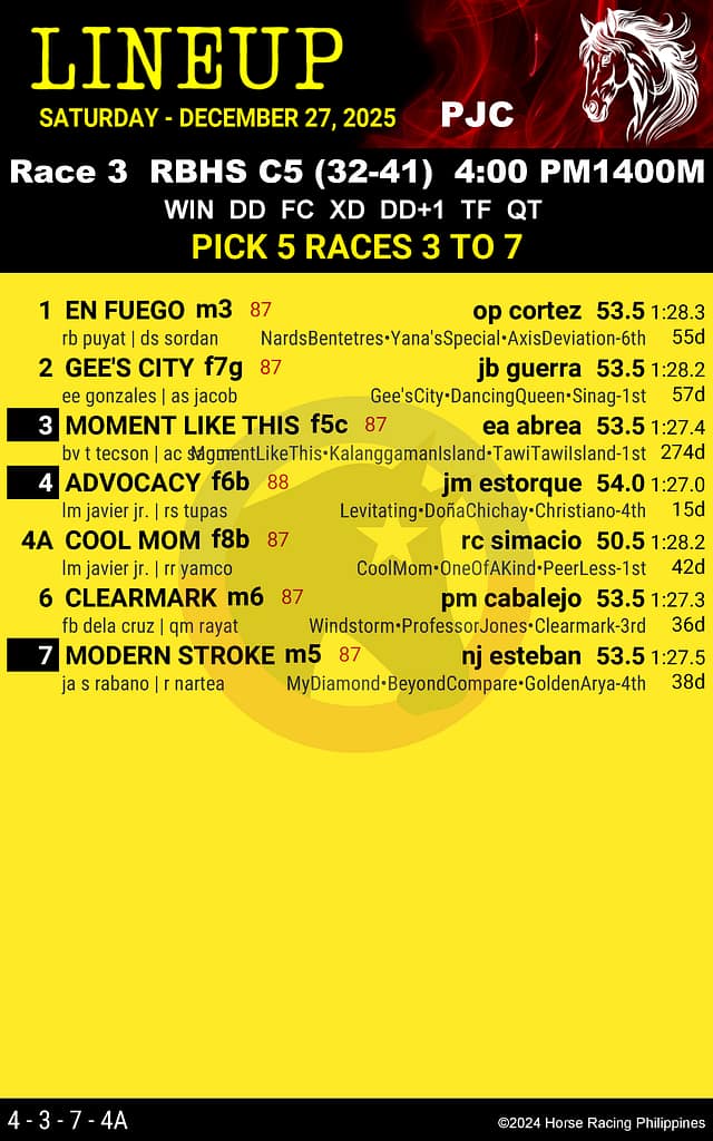 Philippine Jockey Club Race Card for December 27, 2025 – Race 3