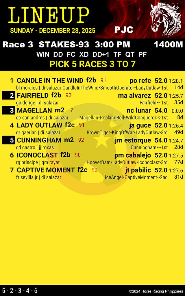 Get the official LineUp race program for Philippine Jockey Club on December 28, 2025 – Race 3. View entries, ratings, trainers, jockeys, and best performance. Free race card online from Horse Racing Philippines, no registration needed.