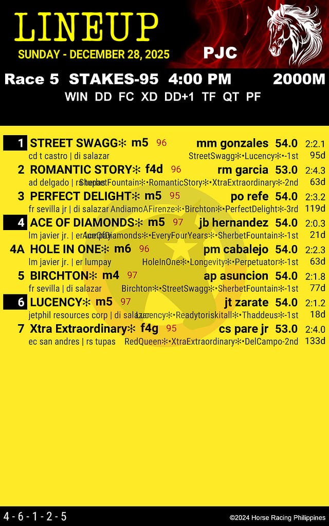 Get the official LineUp race program for Philippine Jockey Club on December 28, 2025 – Race 5. View entries, ratings, trainers, jockeys, and best performance. Free race card online from Horse Racing Philippines, no registration needed.